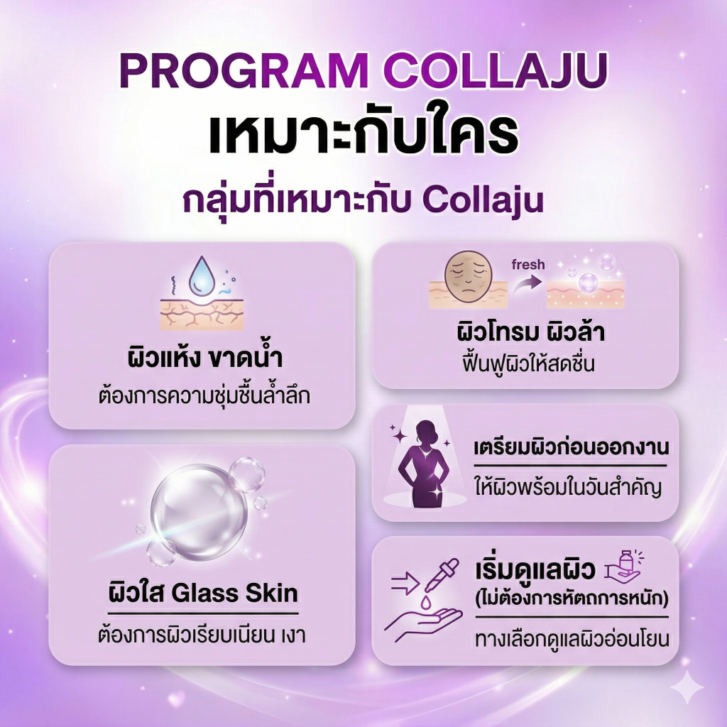 Collaju เหมาะสำหรับผู้ที่ต้องการฟื้นฟูผิวให้ดูฉ่ำใส อิ่มฟู และสุขภาพดีขึ้นแบบเห็นผลไว โดยเน้นการเติมความชุ่มชื้นและปรับผิวให้เรียบเนียนขึ้นอย่างเป็นธรรมชาติ